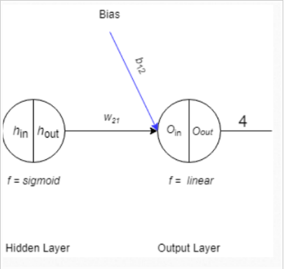 \[\frac{d_{output_{in}}}{d_{w_{21}}} = \frac{d(h_{out}*w_{21}+b_{12})}{d(w_{21})} \\ \frac{d_{output_{in}}}{d_{w_{21}}} = h_{out} \\ \frac{d_{output_{in}}}{d_{w_{21}}} = 0.9933071\]