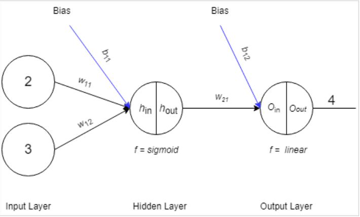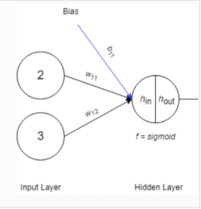 \[h_{in}=x_1*w_{11}+x_2*w_{12}+b_{11} \\ h_{in}= 2*0.5 + 3*1 + 1 \\ h_{in}= 5\]